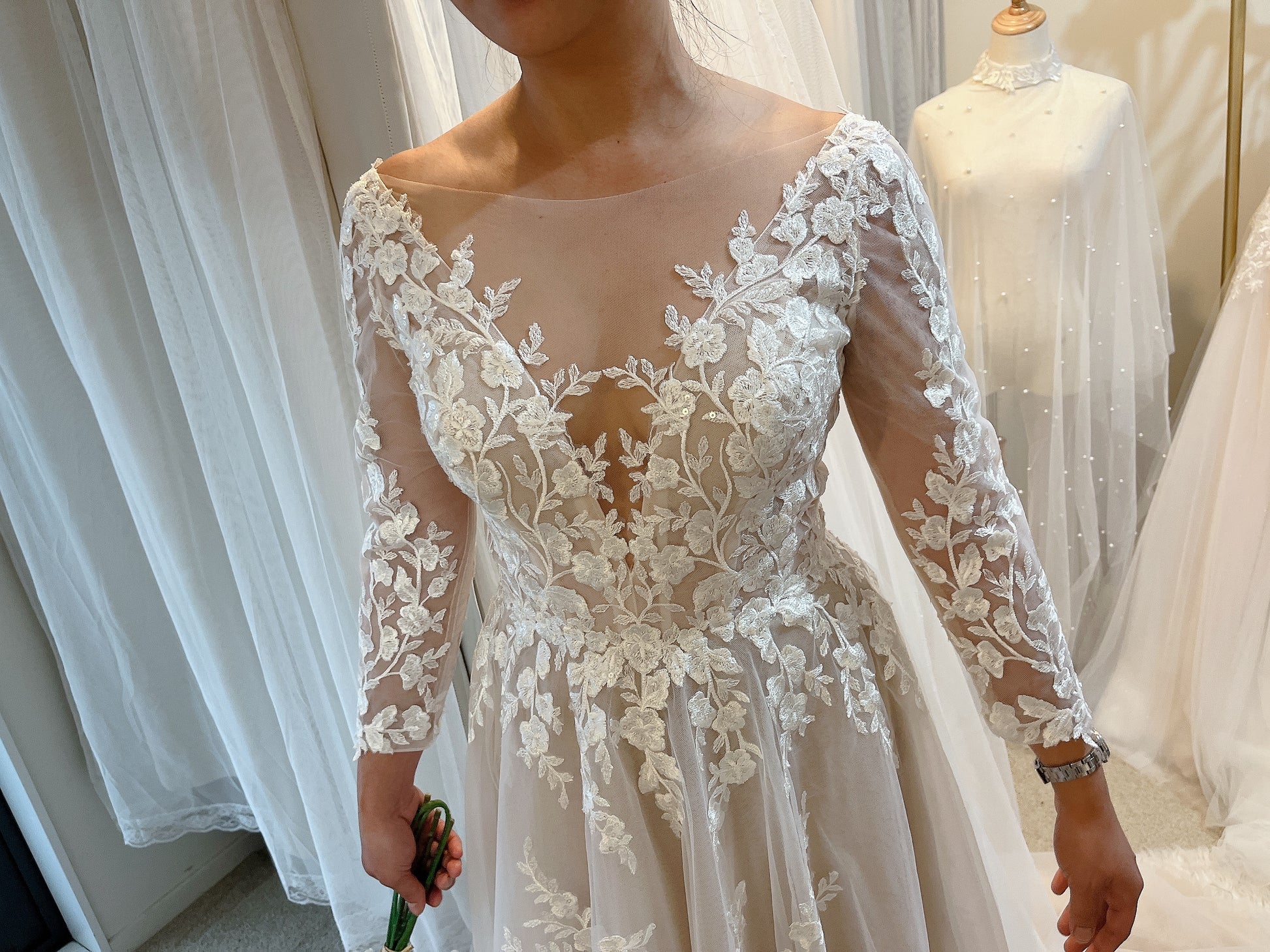 Alcyone emerged like a whispered sigh amidst the blooms—ethereal, serene, and effortlessly captivating. She revealed a quiet truth we had not yet realized we desired: the poetry of long sleeves, the allure of a low-back silhouette, and the subtle enchantment of illusion layers. (#KZ2312411F80-1)