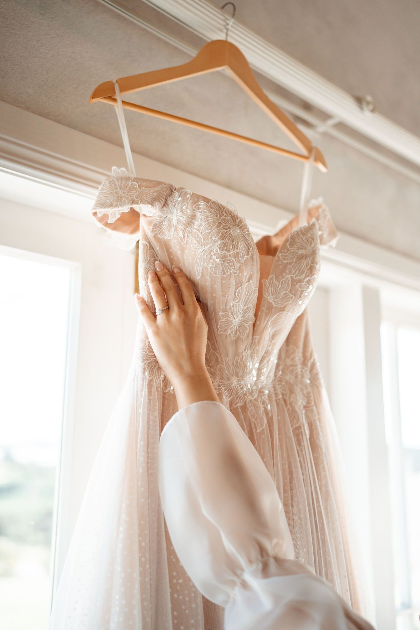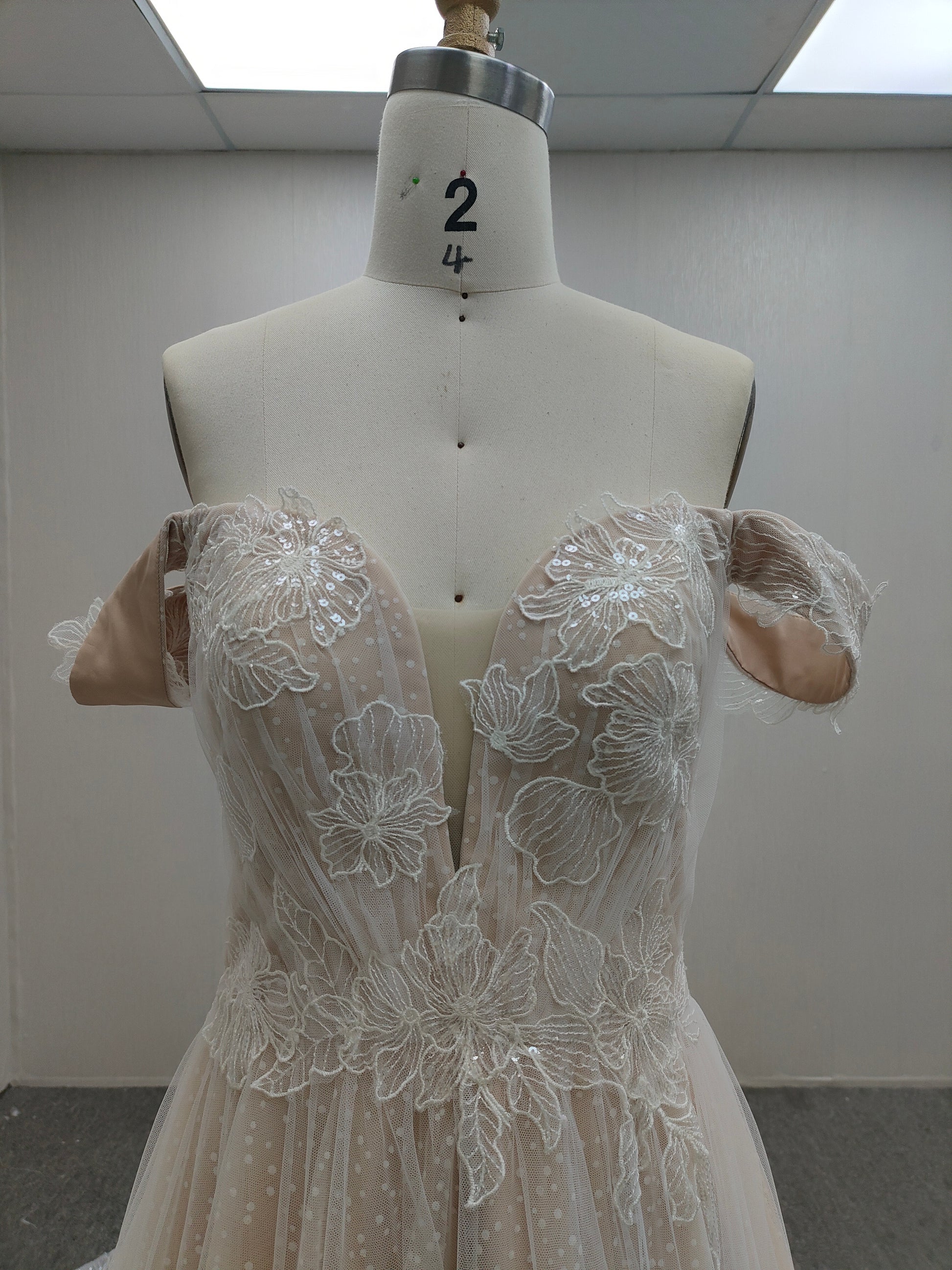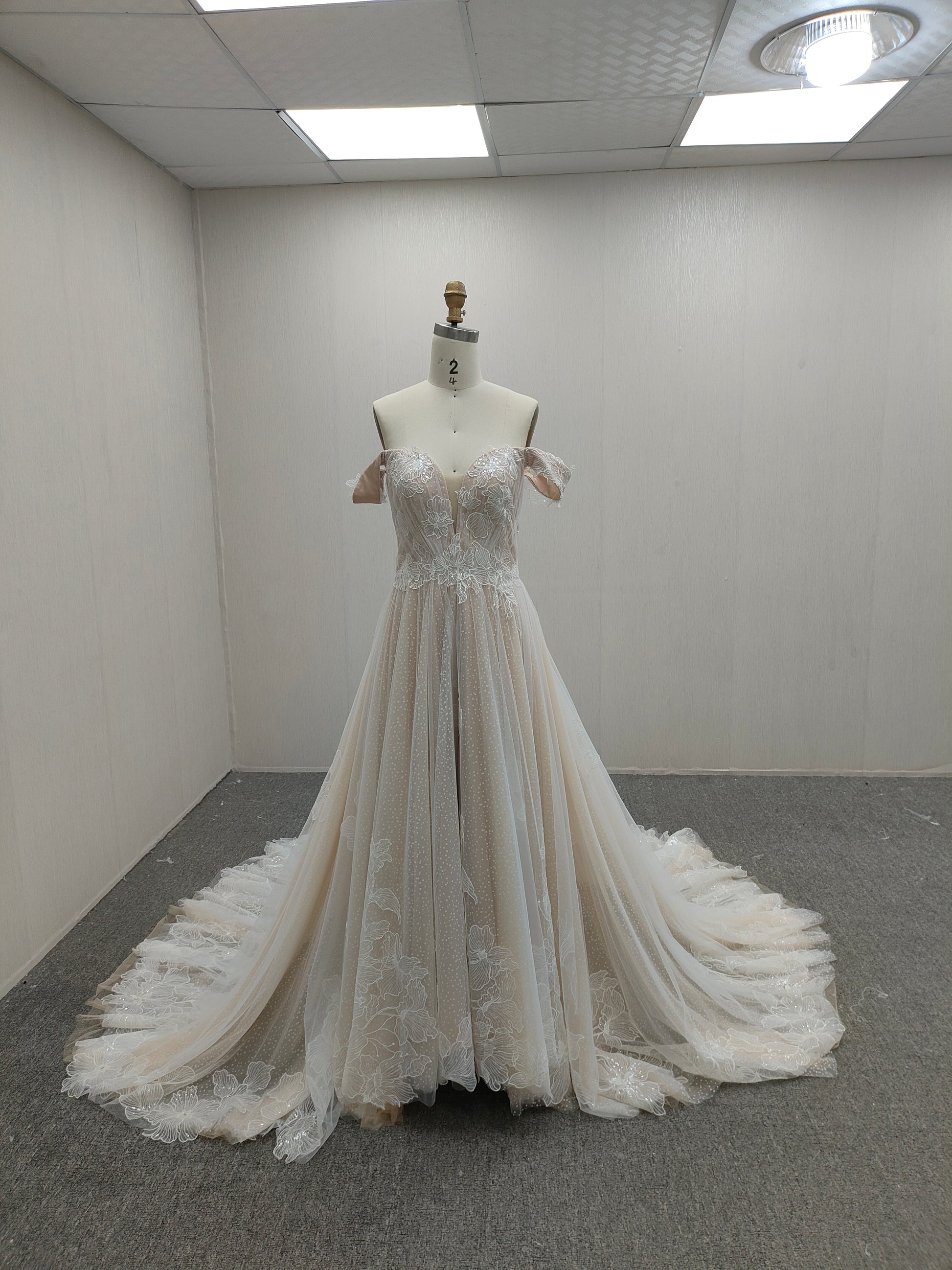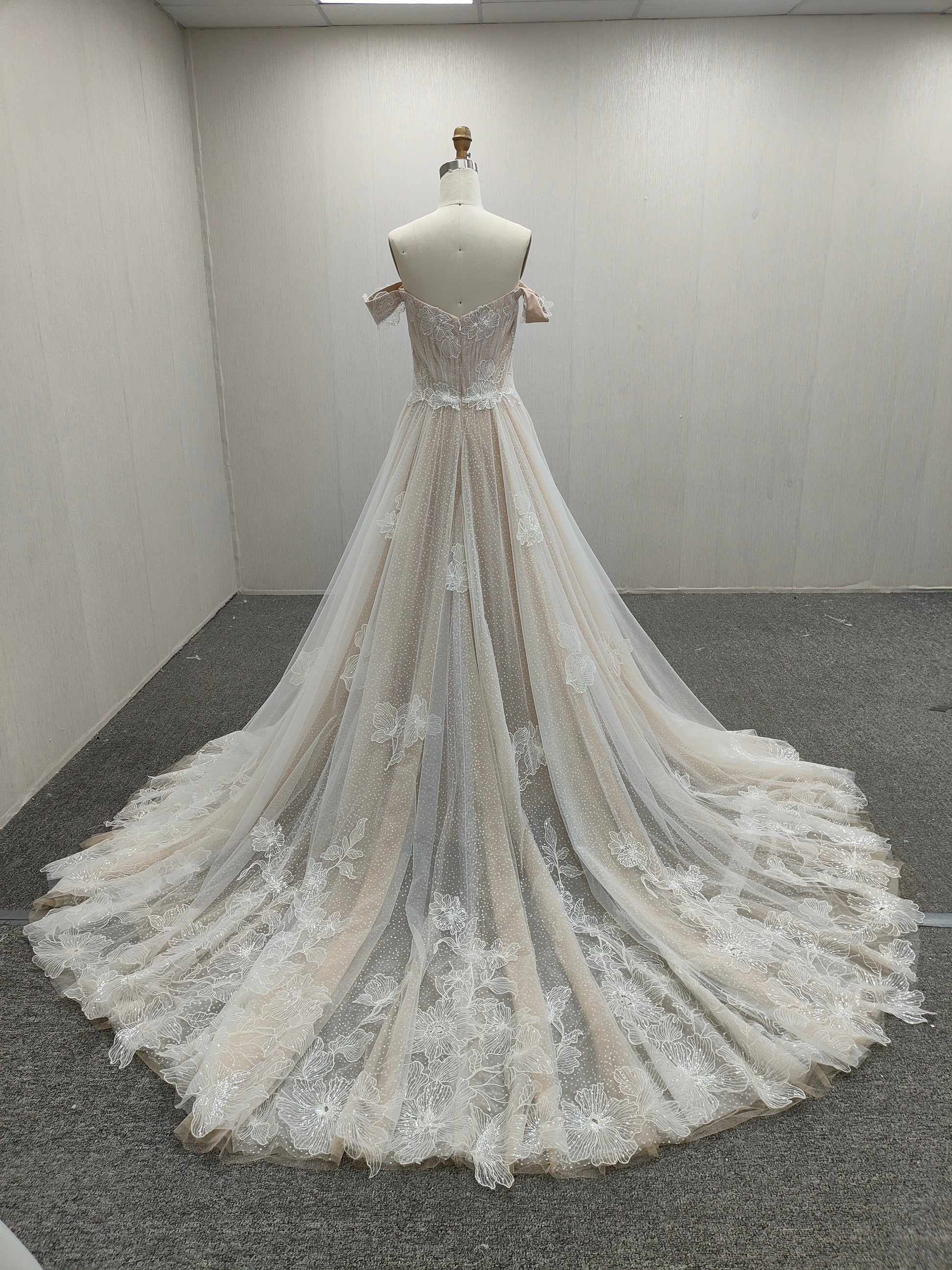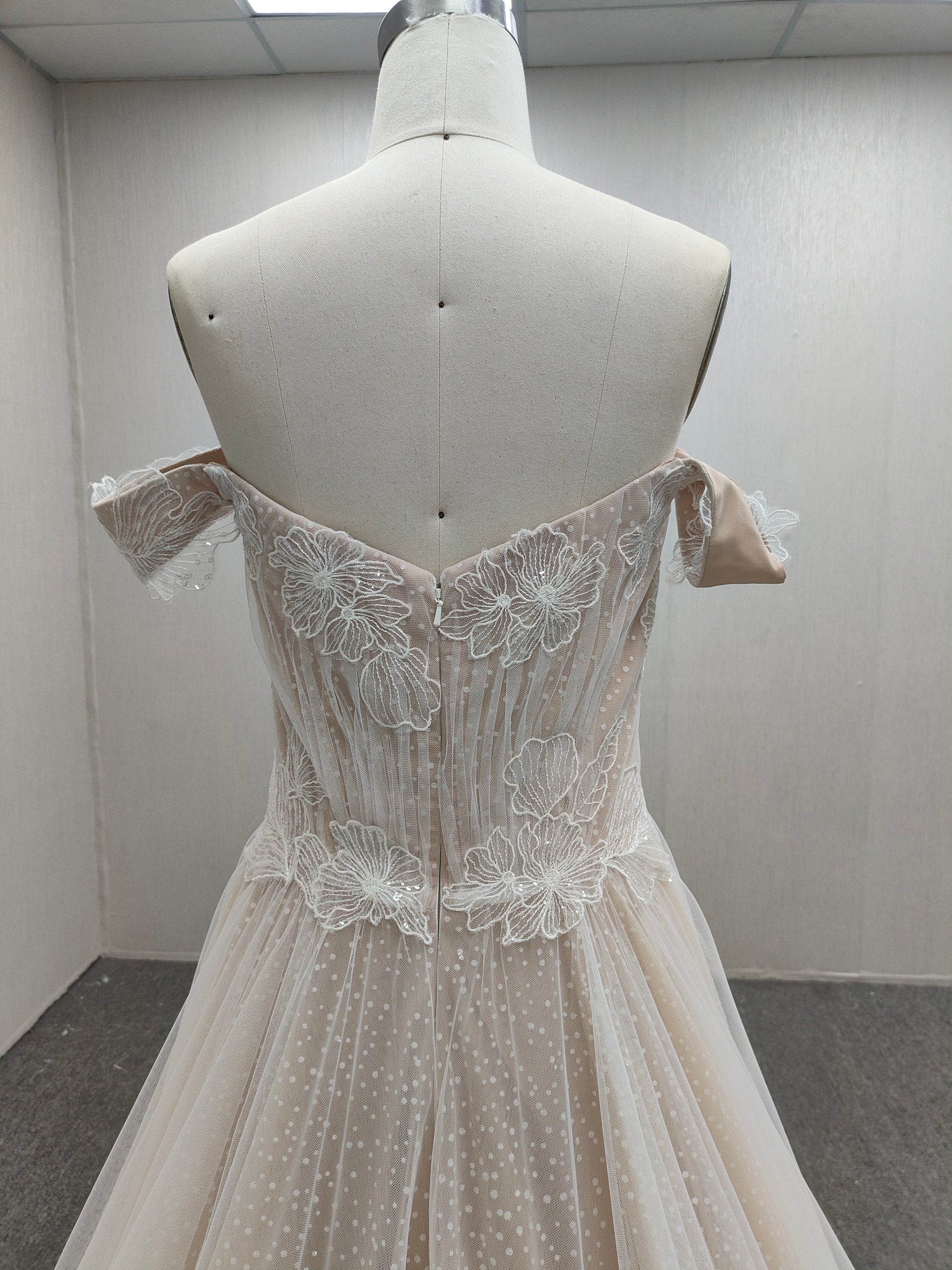 Rendered in a soft nude tone, this A-line gown provides a warm, radiant canvas that enhances the bride’s natural glow. The off-shoulder neckline elegantly frames the collarbones, while a subtle V-front introduces refined structure without disrupting the gown’s pristine silhouette. Beneath its understated simplicity, a second layer adorned with delicate nude accents catches the light with quiet sophistication, adding depth and dimension without excess. (#CM2312341F80-1)