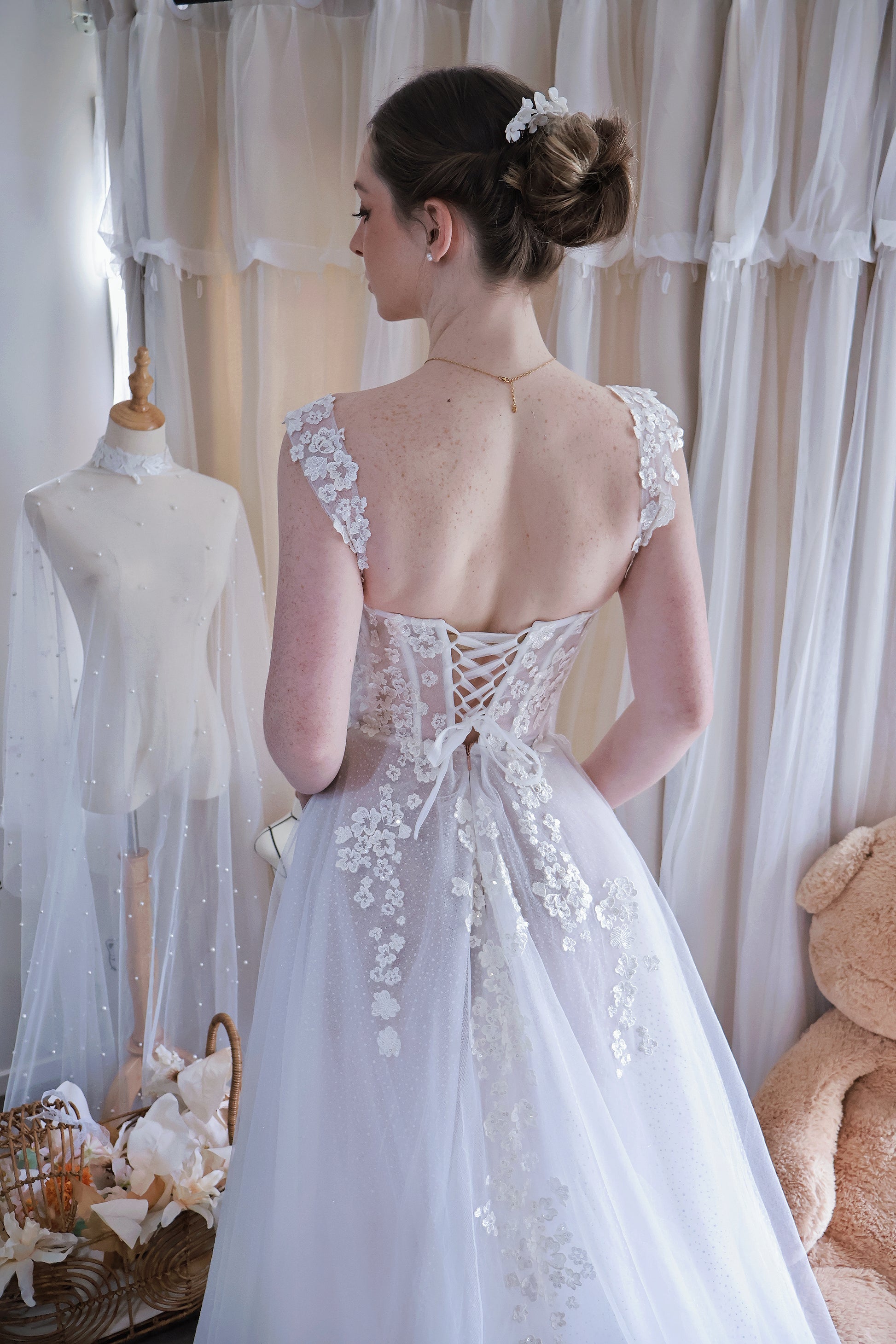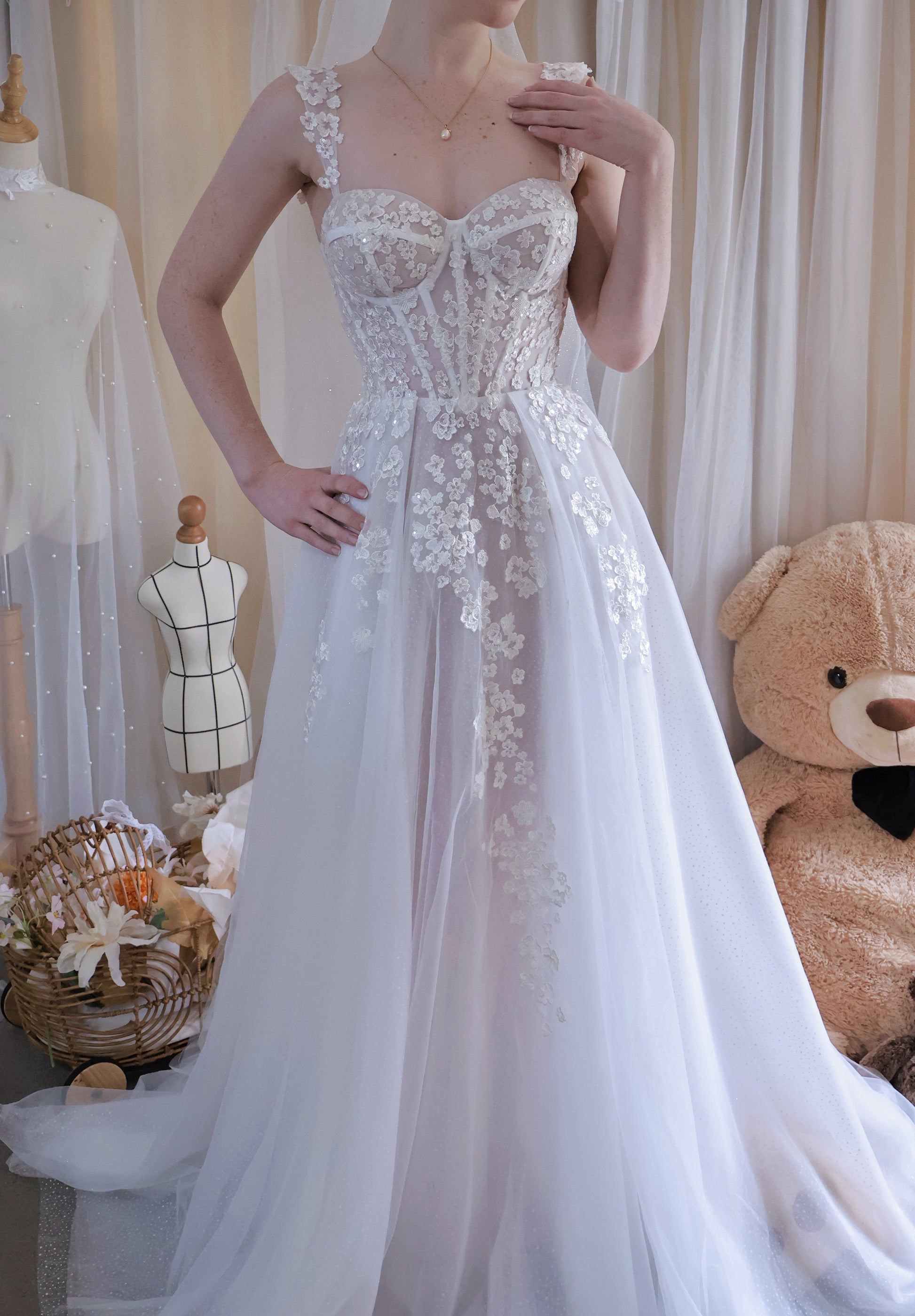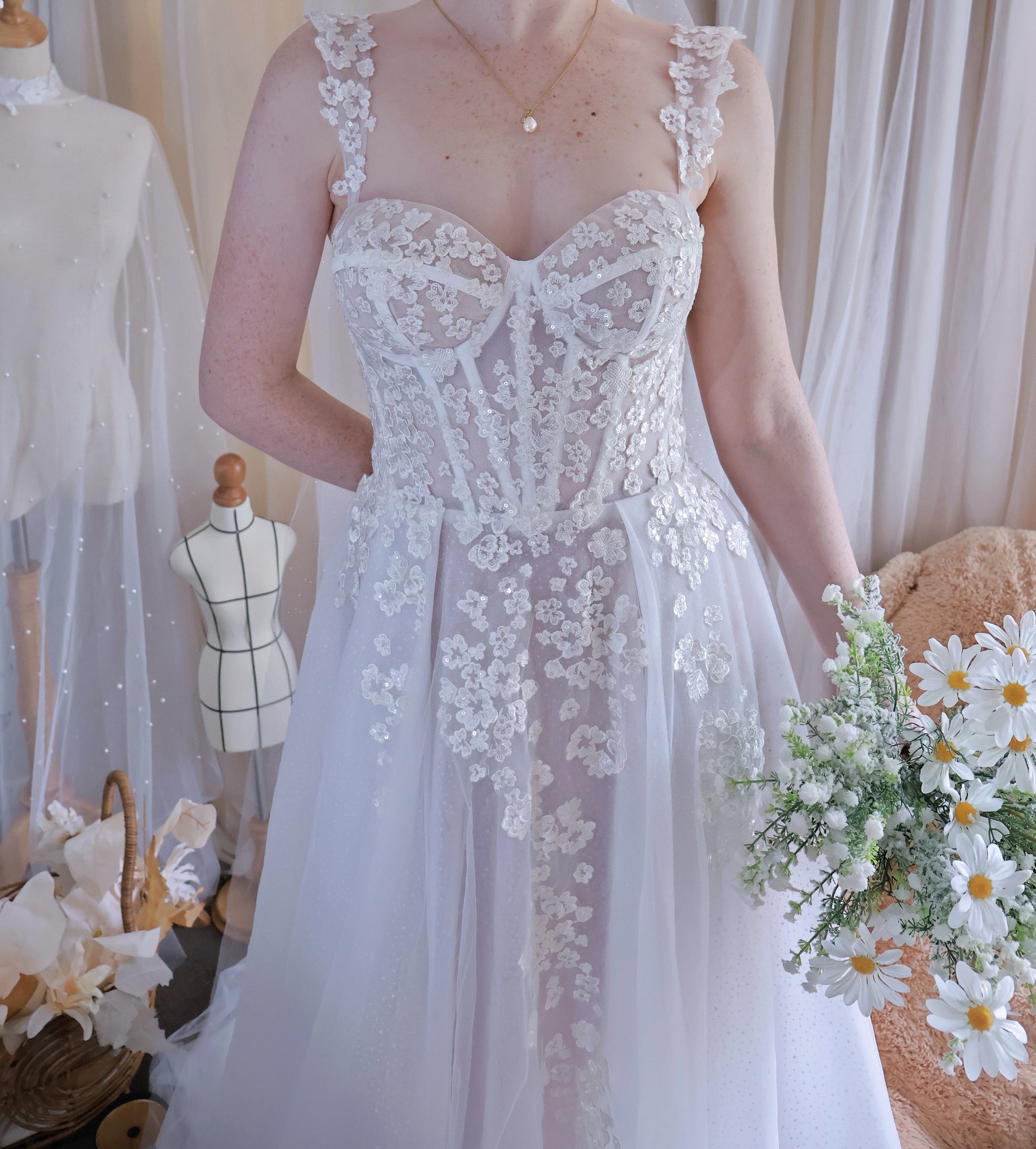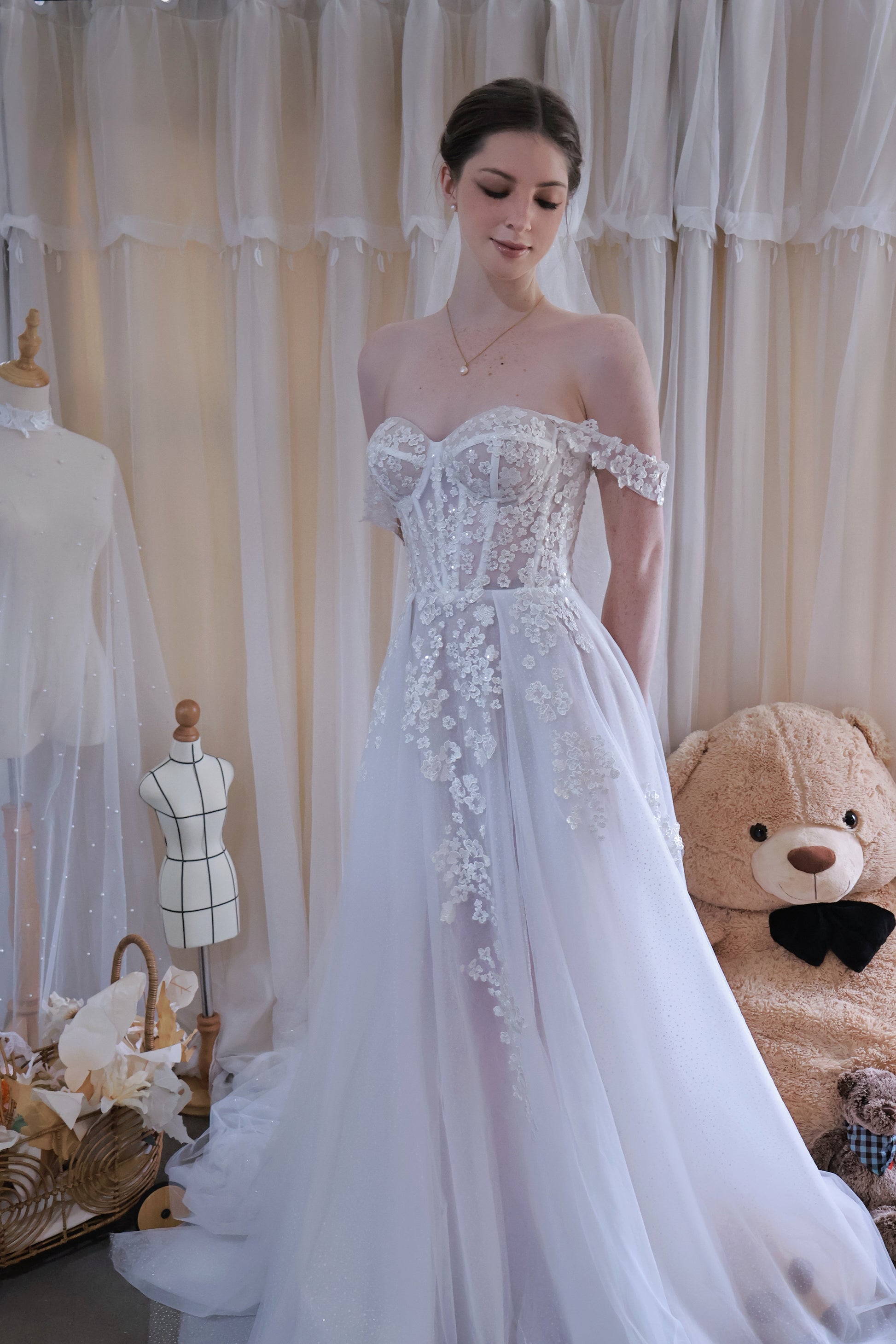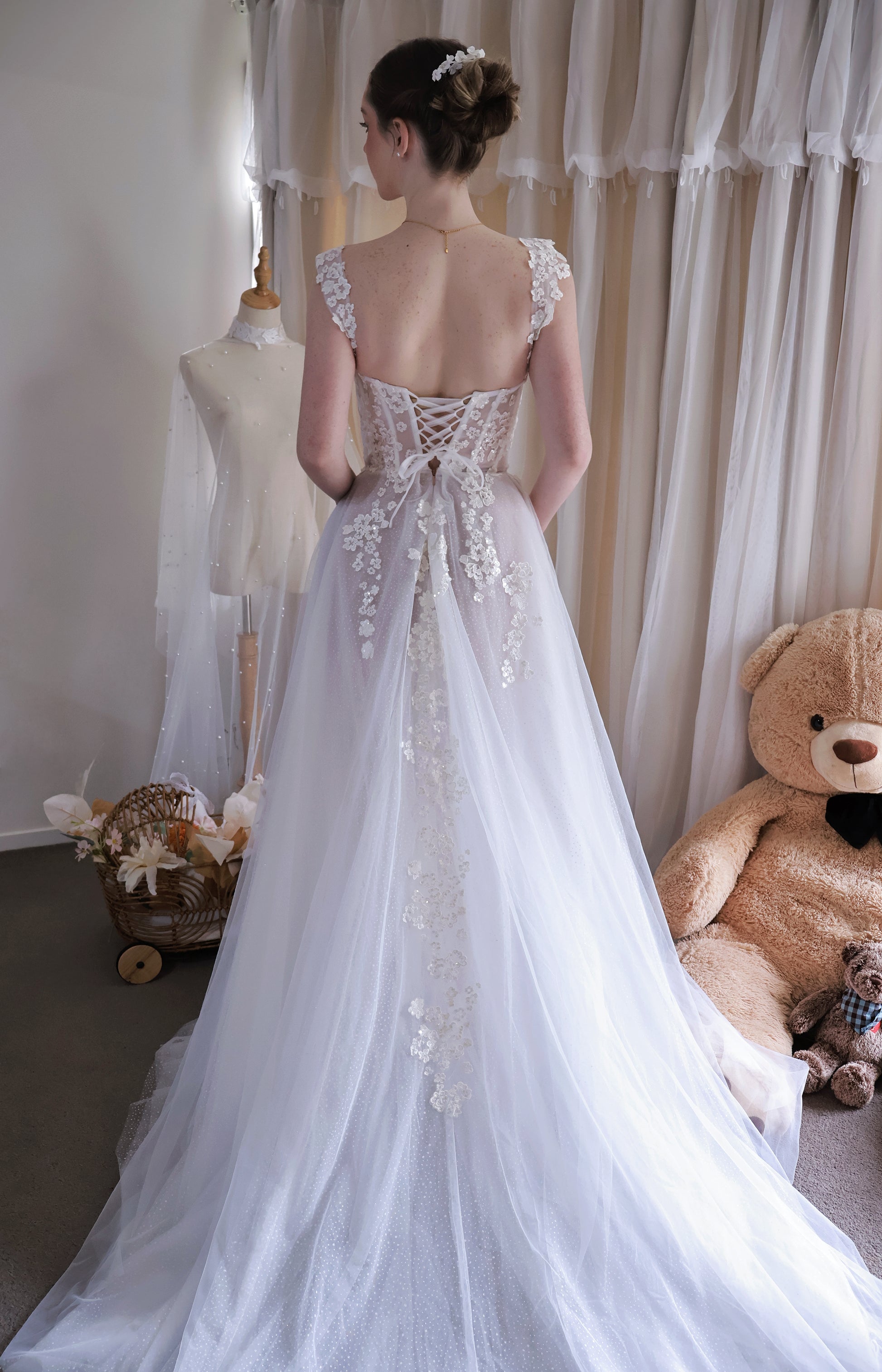 Please note: The price displayed on this page applies solely to the available sample gowns and includes GST. Should you wish to add, adjust, or remove any design elements, additional alteration or customisation fees will be required. For any further special requests, please do not hesitate to contact us directly via text.