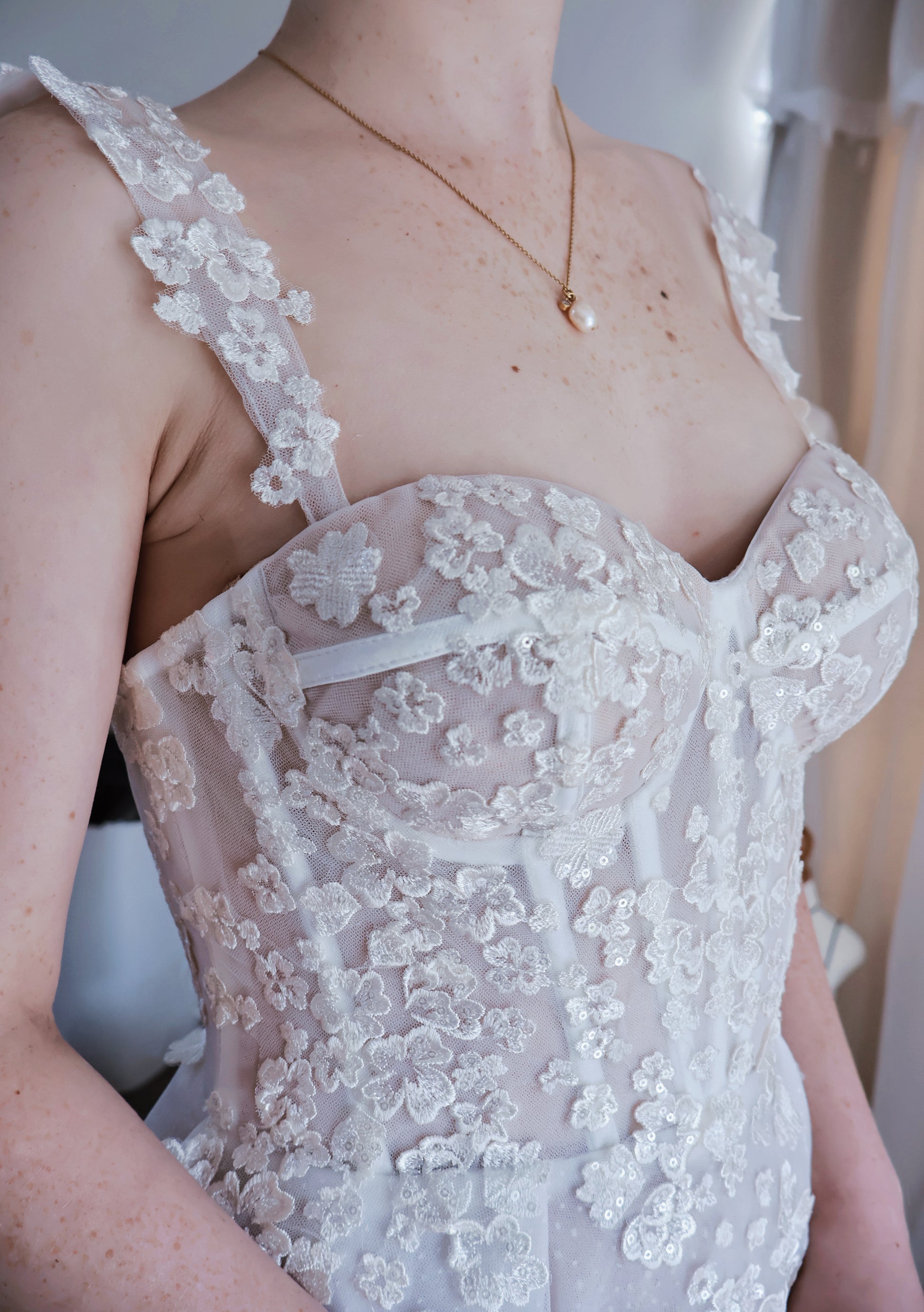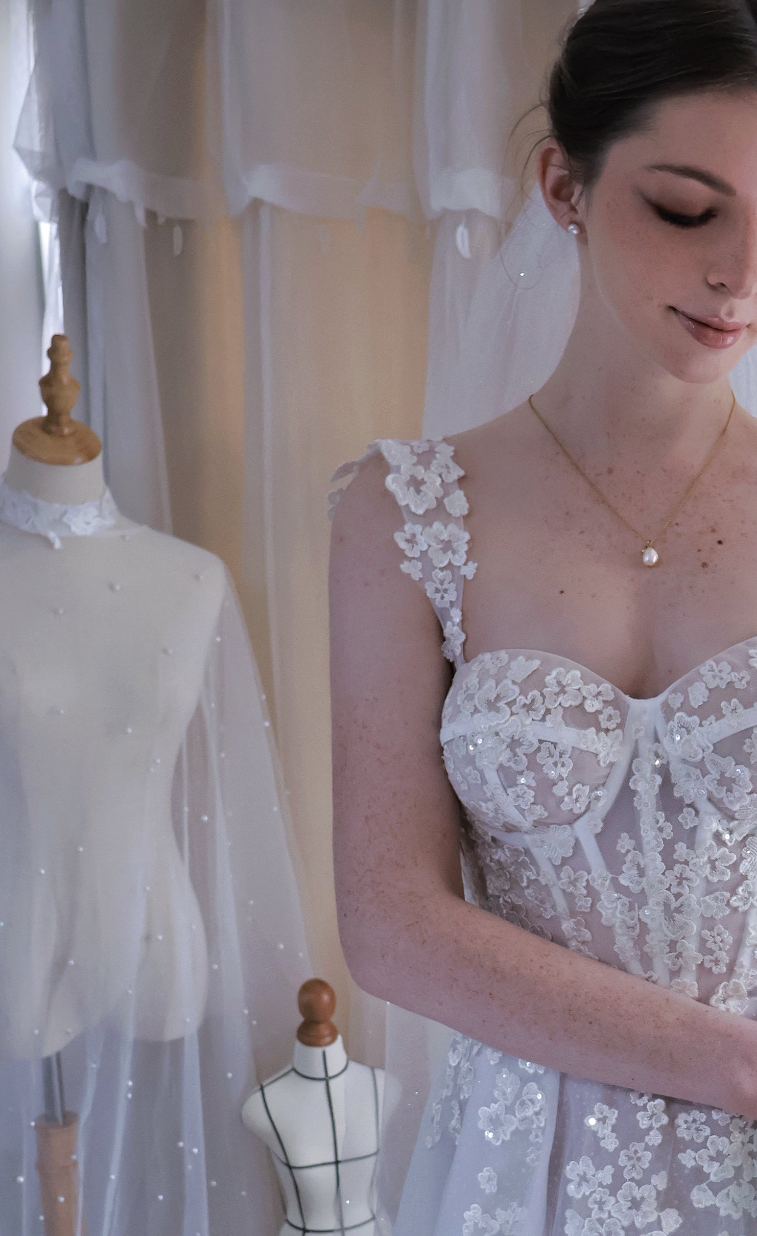 Every gown designed by K.Z undergoes multiple rounds of fitting and prototyping, with each detail carefully refined, so the final combination of fabrics represents the best possible outcome for that design. For our bespoke gowns, every material used—including its colour—is thoroughly discussed with the bride. This ensures that the gown not only reflects her personal style but also embodies the craftsmanship and thoughtful design that make every Wonderland creation truly one-of-a-kind.
