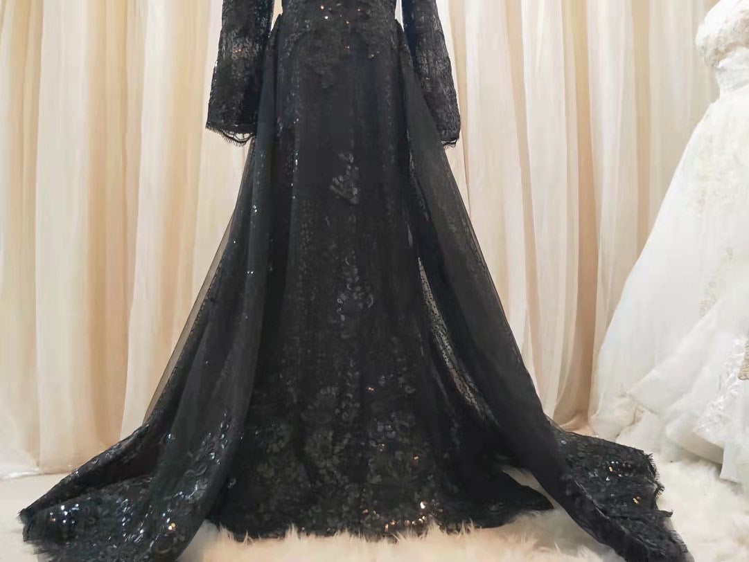 Hecate is a stunning black mermaid gown with a fitted silhouette and long sleeves, fully adorned with shimmering beadwork that creates a luxurious, layered texture.