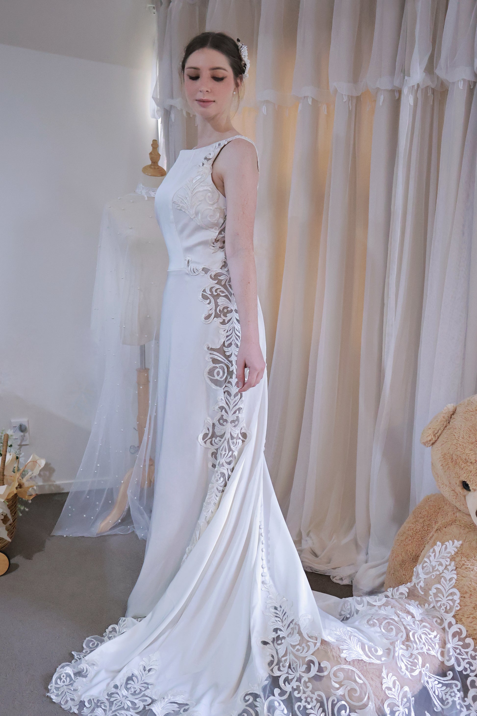 Every gown designed by K.Z undergoes multiple rounds of fitting and prototyping, with each detail carefully refined, so the final combination of fabrics represents the best possible outcome for that design. For our bespoke gowns, every material used—including its colour—is thoroughly discussed with the bride. This ensures that the gown not only reflects her personal style but also embodies the craftsmanship and thoughtful design that make every Wonderland creation truly one-of-a-kind.
