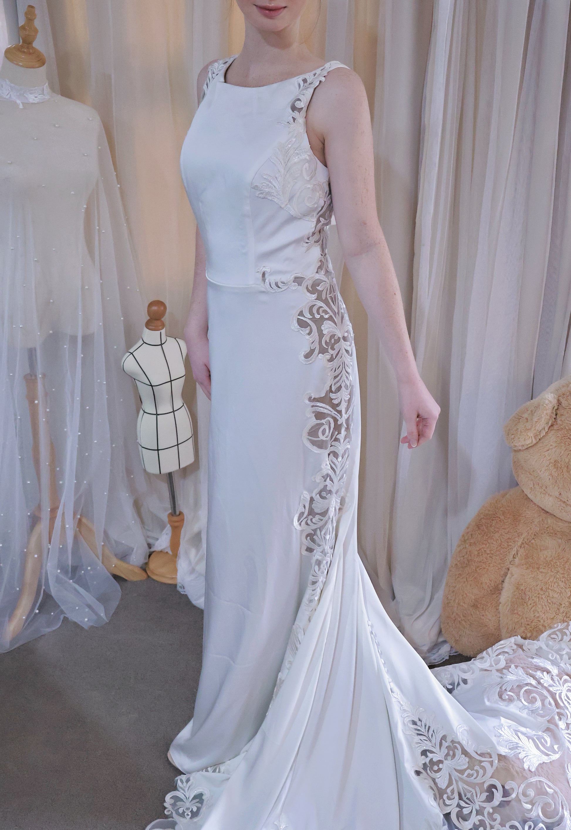 Please note: The price displayed on this page applies solely to the available sample gowns and includes GST. Should you wish to add, adjust, or remove any design elements, additional alteration or customisation fees will be required. For any further special requests, please do not hesitate to contact us directly via text.
