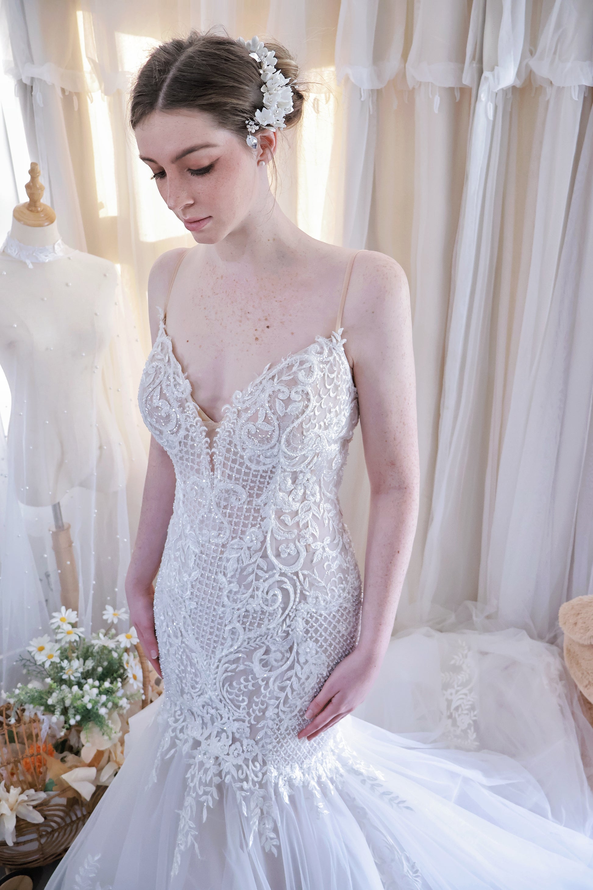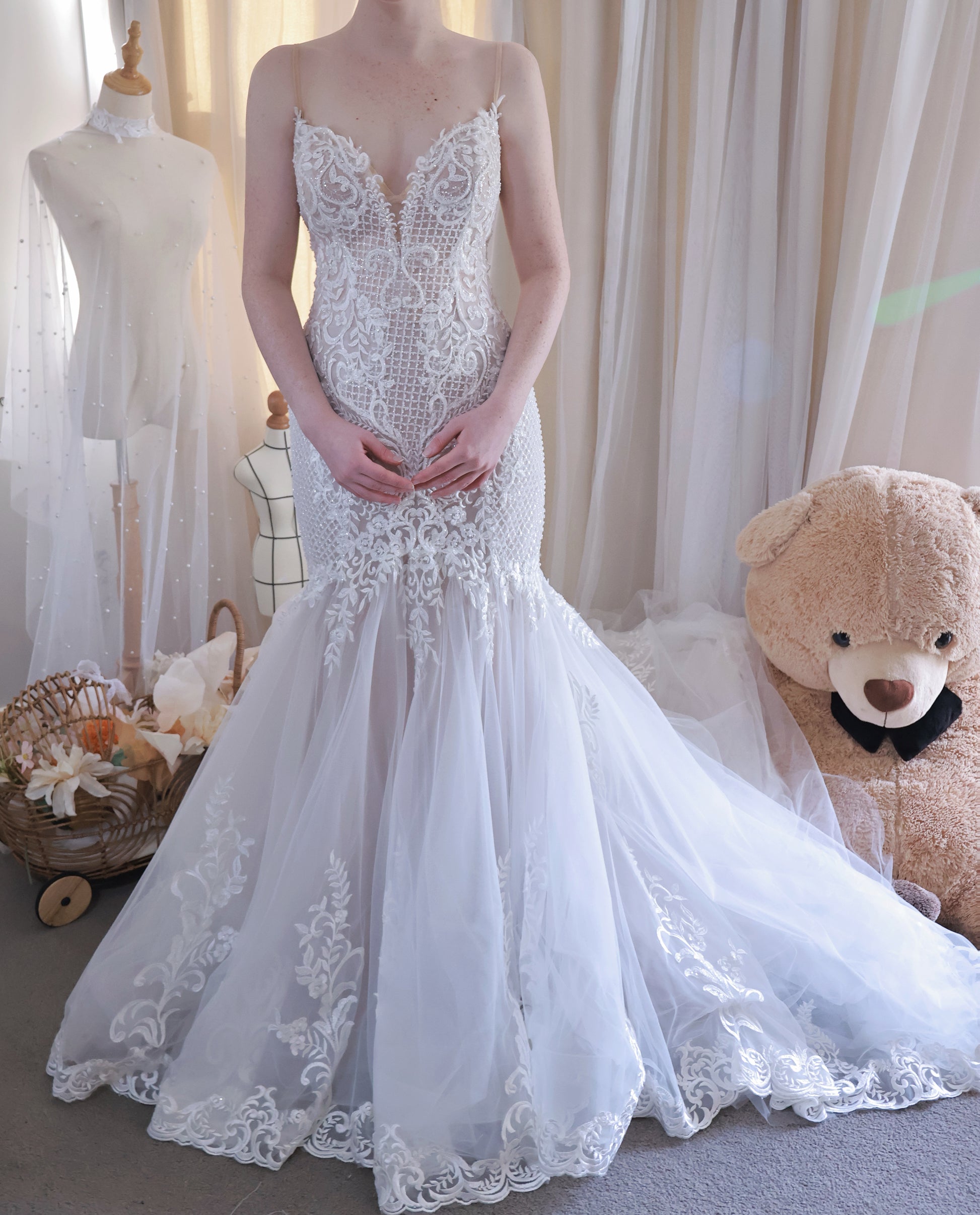 Please note: The price displayed on this page applies solely to the available sample gowns and includes GST. Should you wish to add, adjust, or remove any design elements, additional alteration or customisation fees will be required. For any further special requests, please do not hesitate to contact us directly via text.