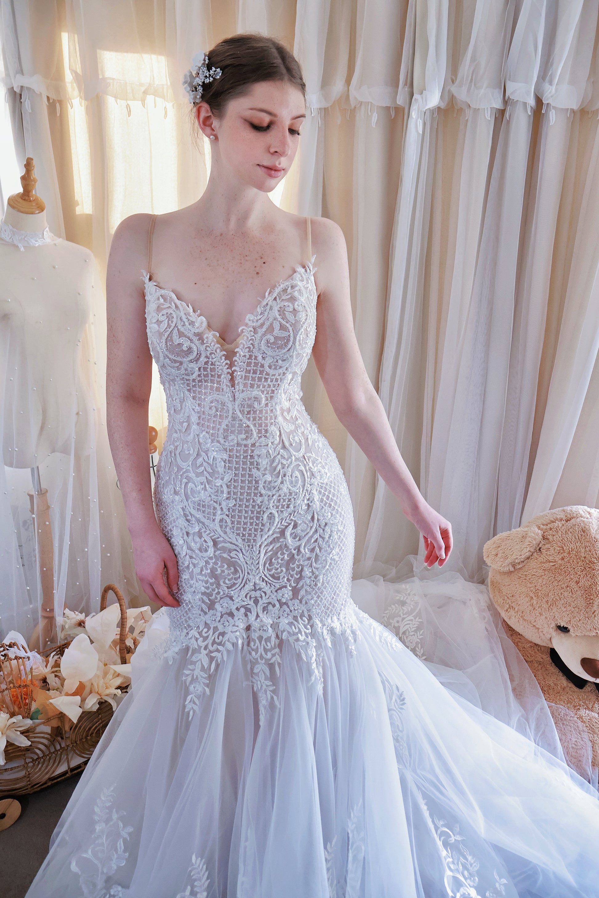The Venus is a truly luxurious gown, adorned with intricate beadwork and delicate lace that exude elegance and refined sophistication. Beaded lace motifs are carefully layered over soft underlying fabric, creating a textured and graceful effect. Its deep V-neckline with a mesh overlay and V-back design elevate modern elegance, while the mermaid silhouette beautifully flatters the figure. The dramatic long train, extending approximately 1–1.2 meters, can be adjusted to any preferred length, flowing effortlessly with each step and commanding attention for grand entrances and unforgettable moments. Every element is meticulously crafted to highlight the bride’s natural beauty, reflecting exceptional craftsmanship and timeless allure. (#KZ2408447F80-1)