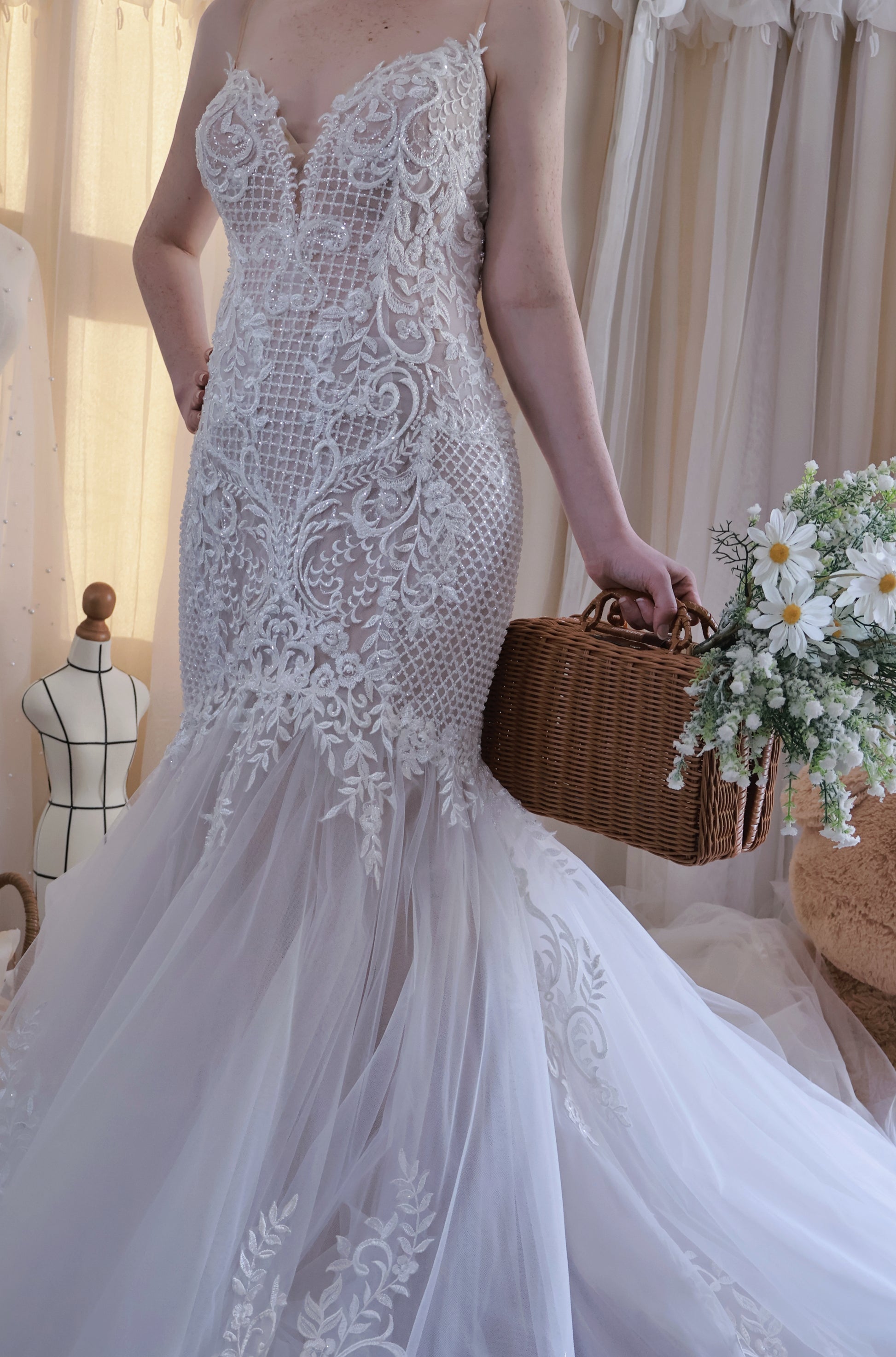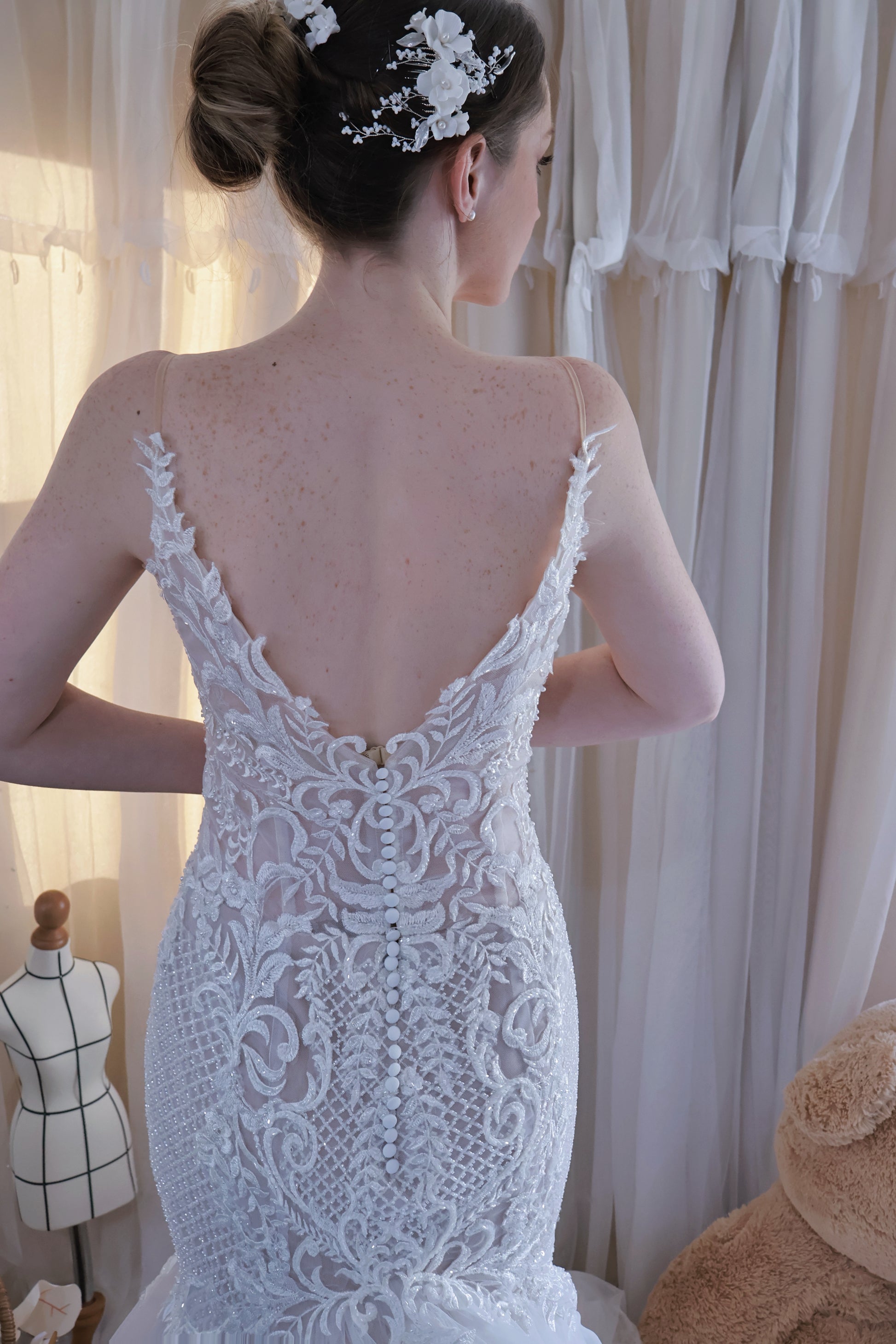 Every gown designed by K.Z undergoes multiple rounds of fitting and prototyping, with each detail carefully refined, so the final combination of fabrics represents the best possible outcome for that design. For our bespoke gowns, every material used—including its colour—is thoroughly discussed with the bride. This ensures that the gown not only reflects her personal style but also embodies the craftsmanship and thoughtful design that make every Wonderland creation truly one-of-a-kind.